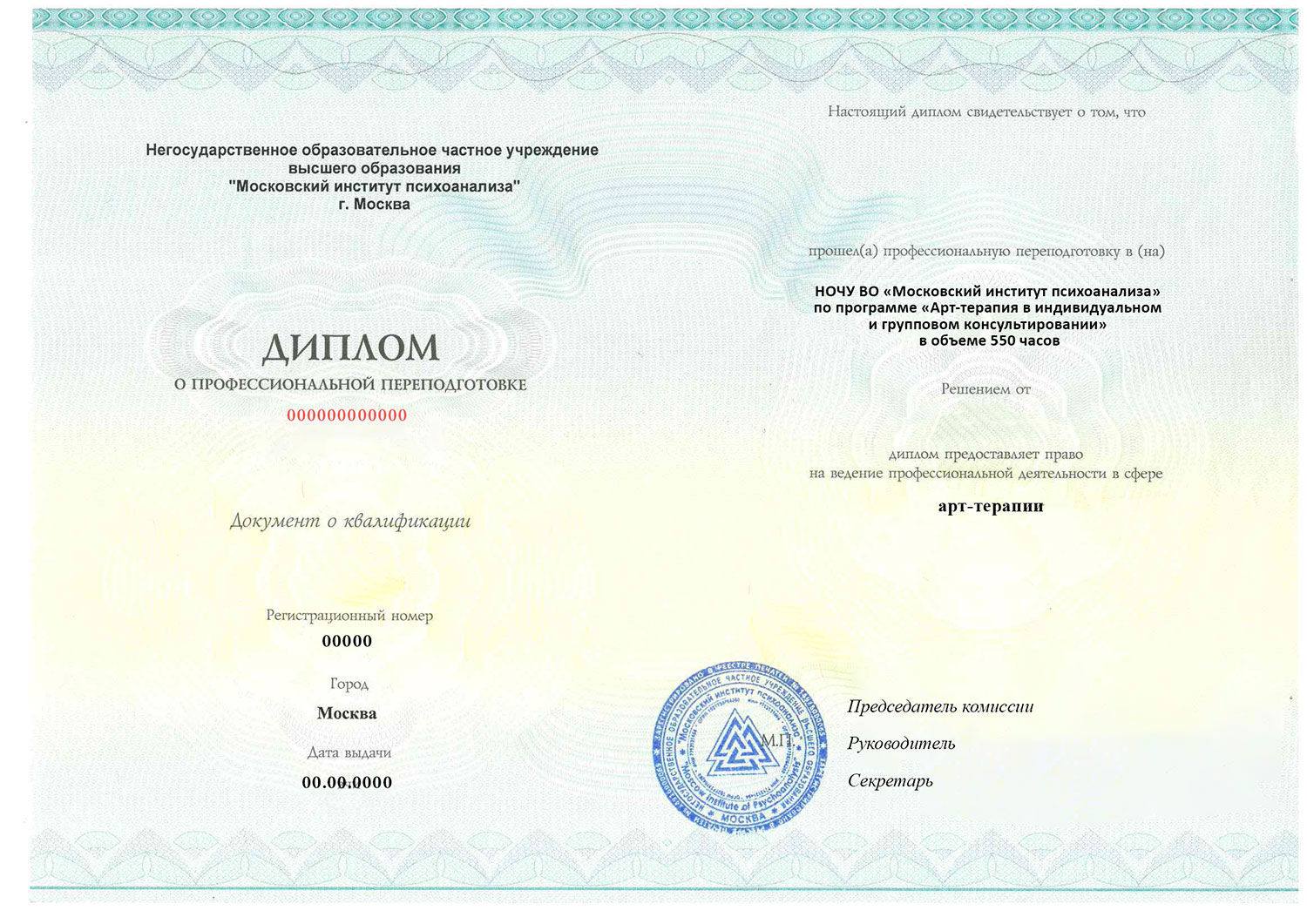 - В конце обучения — Диплом о профессиональной переподготовке Московского института психоанализа (МИП).